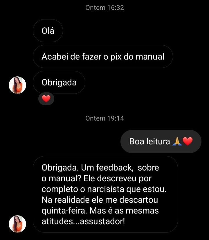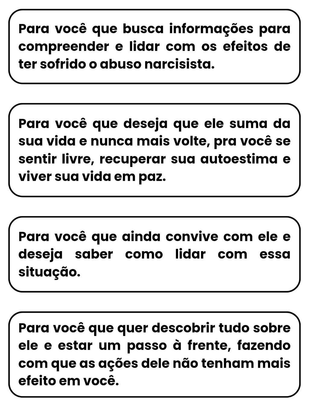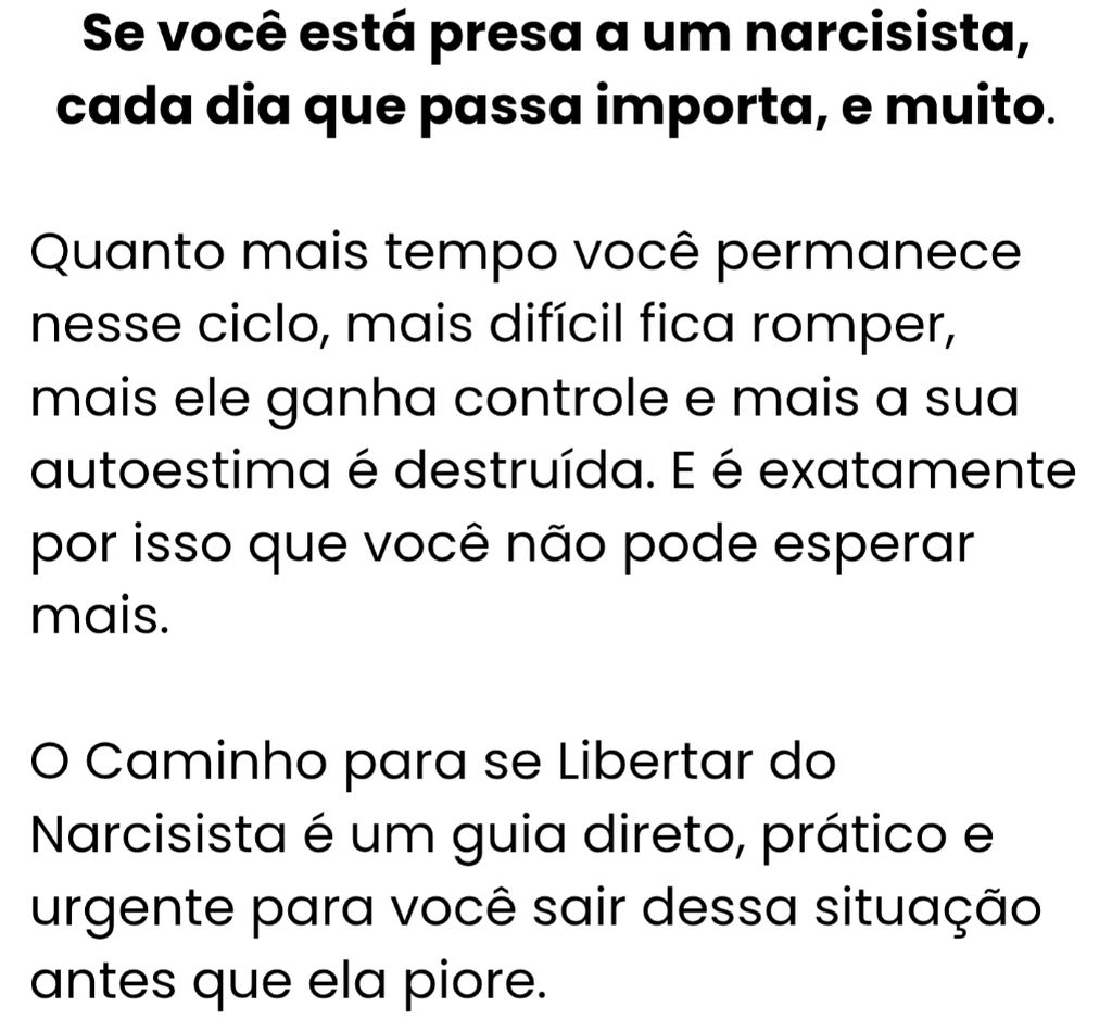 NUNCA MAIS CORRA O RISCO DE TER UM NARCISISTA NA SUA VIDA! Receba agora um manual exclusivo com 208 páginas que vão te revelar 50 sinais pra você identificar narcisistas em RELACIONAMENTOS, AMIZADE, FAMÍLIA e TRABALHO, te mostrando 50 coisas que narcisistas FAZEM E FALAM em diversas situações, juntamente com a explicação dos MOTIVOS que geram essas atitudes. Normalmente, este guia custa R$ 30,00, mas se você garantir em conjunto, você pode levá-lo por apenas R$ 8,90! Marque a opção e aproveite!