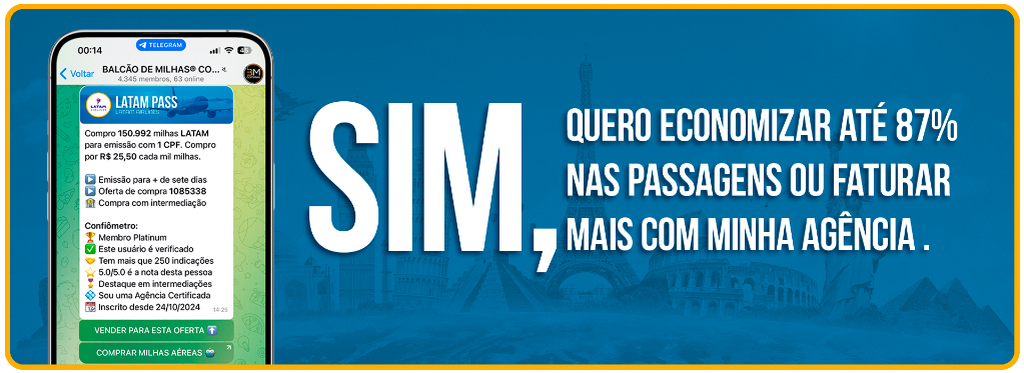 ✅ Receba alertas diários com as melhores estratégias de compra e transferência bonificada de milhas aéreas dos principais programas e clubes. Fique por dentro das oportunidades mais vantajosas antes de todo mundo. 💰 Ideal para quem quer multiplicar milhas e economizar!