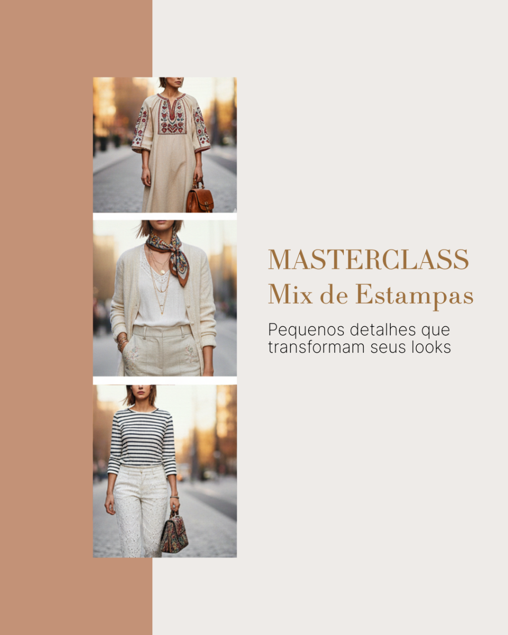 Aprenda a tirar seus looks do óbvio, amplie o seu repertório visual e use o mix de estampas de forma leve, sutil e autêntica — sem exageros e sem medo.