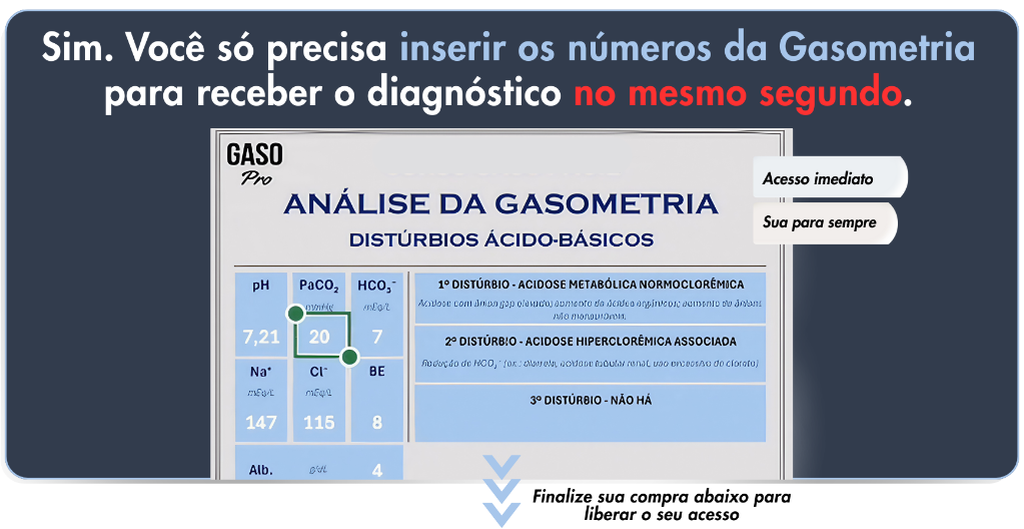 Leve também o Gaso Fácil, o curso completo que te ensina a interpretar e tratar qualquer gasometria. Perfeito para você conduzir seus pacientes. A Calculadora te dá o resultado. O Gaso Fácil te ensina a entender, interpretar e manejar o paciente com segurança. Inclui: ✔ Aulas gravadas do básico ao avançado ✔ Tratamento dos distúrbios (incluindo mistos) ✔ PDFs para consulta rápida ✔ Certificado ✔ Suporte direto com o professor