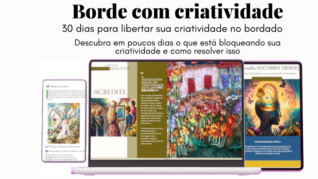 10 Exercícios Mágicos para Destravar a Criatividade 10 Exercícios Mágicos para Destravar a Criatividade é uma verdadeira jornada de autodescoberta. Cada um dos 10 volumes, com 10 exercícios em cada, foi criado para despertar algo mágico dentro de você — uma combinação única de técnicas e reflexões que vão muito além da prática comum do bordado. Aqui, você não segue apenas regras, você explora, experimenta e se surpreende com suas próprias criações. Esses exercícios são desenhados para tirar vo