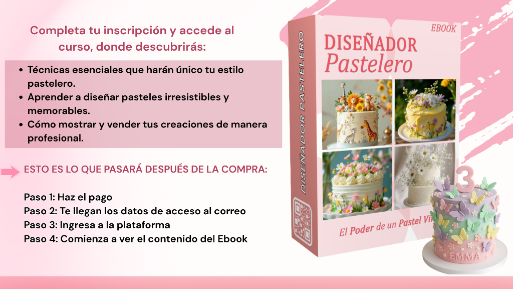Complementa tu ebook Diseñador de Pasteles con más de 30 técnicas profesionales que te ayudarán a crear decoraciones únicas, elegantes y llenas de estilo. Aprende secretos que marcan la diferencia y lleva tus creaciones al siguiente nivel. 🍰✨