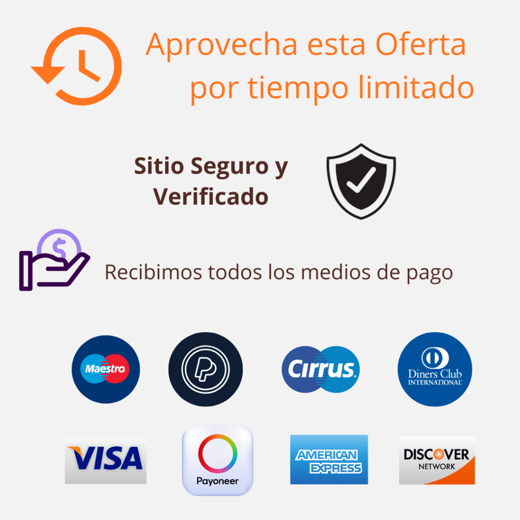 Paga tu producto con la confiabilidad de una de las plataformas más seguras de la WEB y la confianza de devolución del tu dinero si no estás conforme con lo que haz comprado, aunque estamos seguros de que no te arrepentirás.