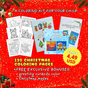 Christmas Kit of 3 Coloring Books, designed for children and adults to share moments of creativity, laughter, and togetherness at home. + 2 Bonuses completely FREE.