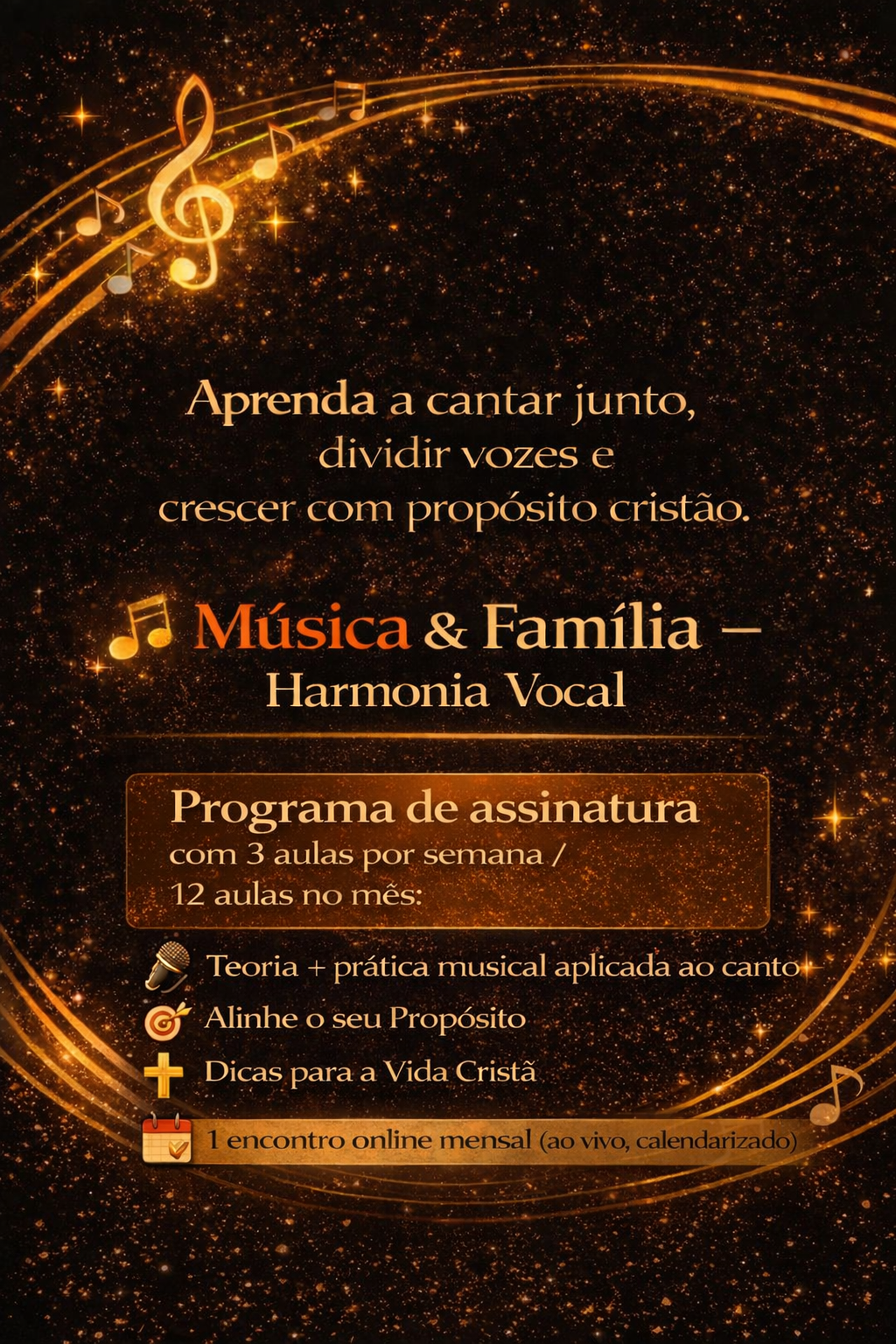 Programa de assinatura para aprender a cantar em grupo, dividir vozes (uníssono, 2ª e 3ª), desenvolver afinação, escuta e harmonia, com leveza e propósito cristão. Assinatura recorrente sem comprometer o limite do seu cartão. Assine agora e aproveite!