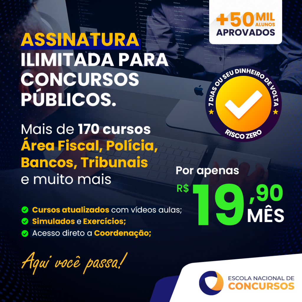Com a ASSINATURA ATÉ PASSAR da Escola Nacional de Concursos, você tem acesso a todos os cursos preparatórios até passar em um concurso. Área Fiscal, Receita Federal, Polícias, Tribunais, Bancos, INSS, Prefeituras, OAB e mais, você tem um mega arquivo atualizado permanentemente com todos os temas de aula para que, além dos cursos já prontos, você possa montar seu próprio preparatório para qualquer concurso do país nas esferas municipal, estadual e federal.