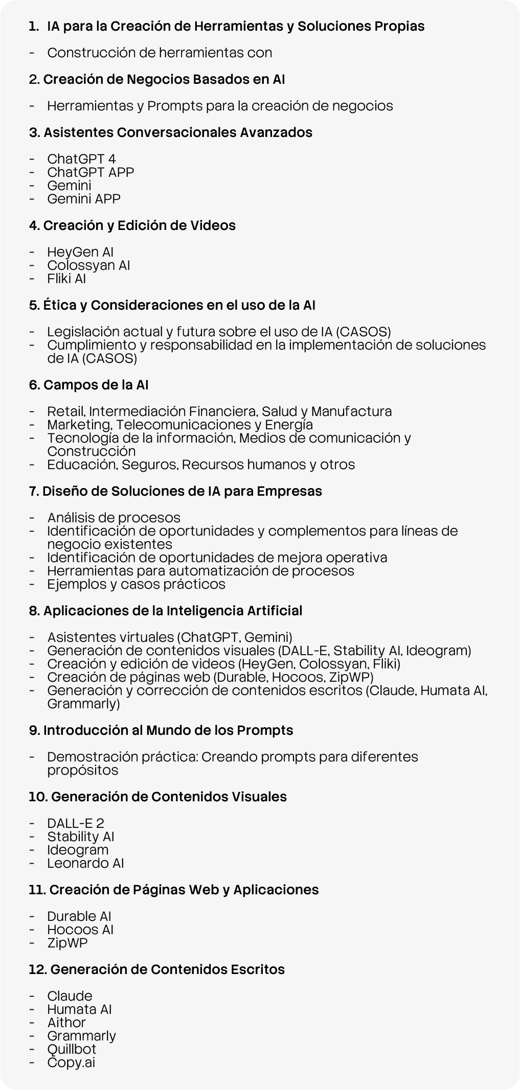 Domina la vanguardia tecnológica: aprende a crear soluciones con ChatGPT, Gemini y herramientas No-code. Diseña negocios, automatiza procesos y genera contenidos impactantes con DALL-E, HeyGen y Claude. Potencia tu productividad con IA aplicada a mercados reales y ética profesional.