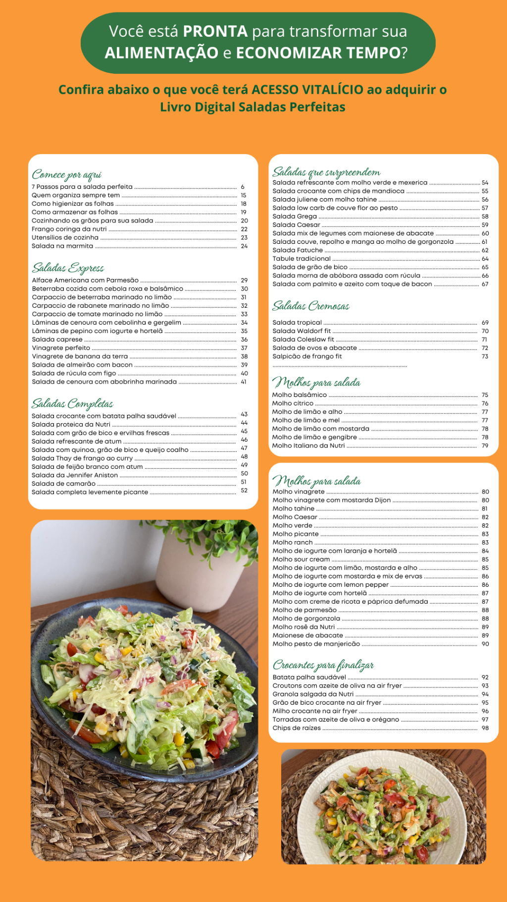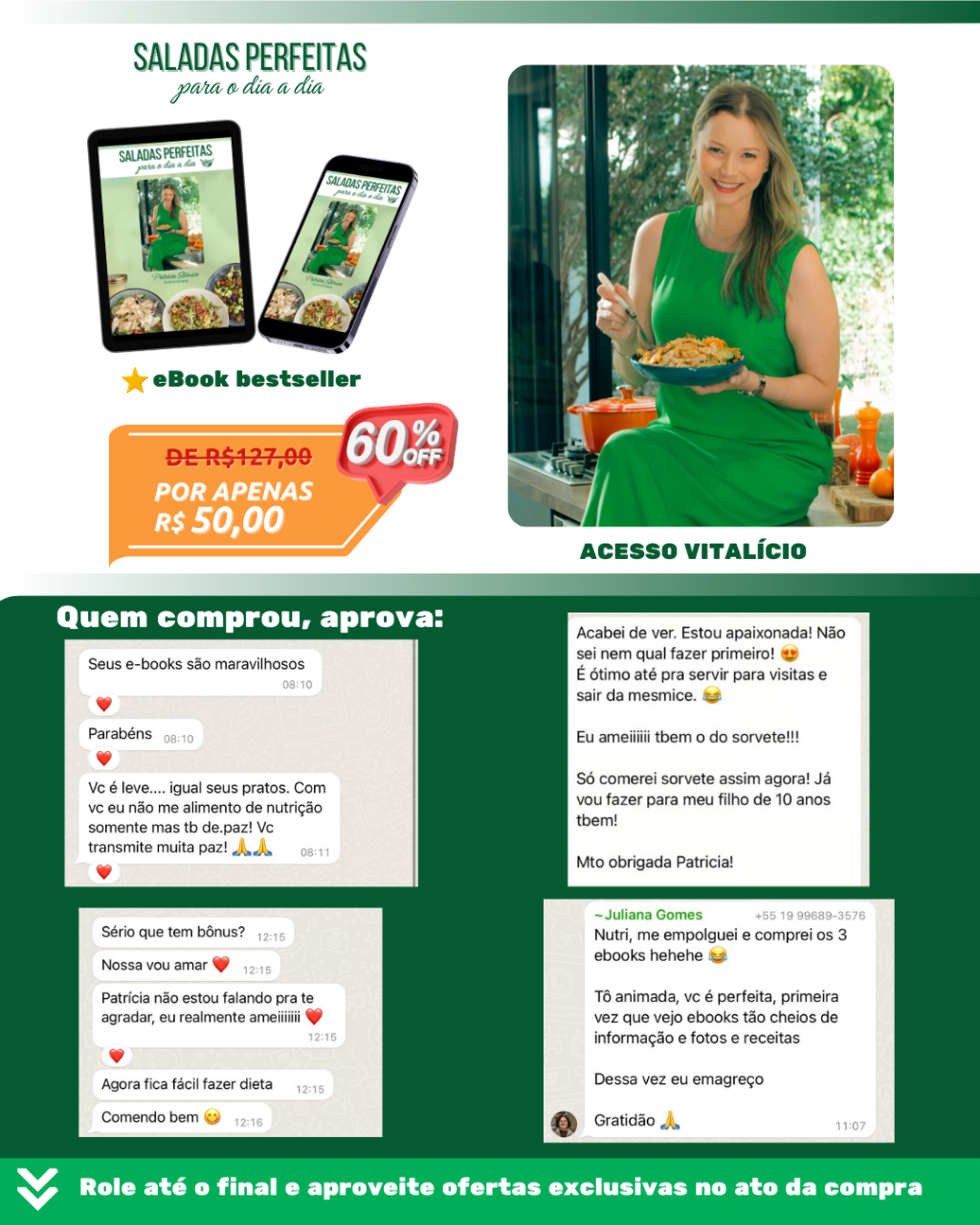 SOMENTE AQUI NESTA PÁGINA. Garanta seu Ebook 110 Receitas Saudáveis com um DESCONTO ESPECIAL!! São 110 receitas (café; da manhã;, almoço, lanche da tarde e jantar) com tabela de calorias, macronutrientes, rendimento e porção sugerida. Acesso vitalício *Ao sair desta página você perderá; essa oportunidade de desconto