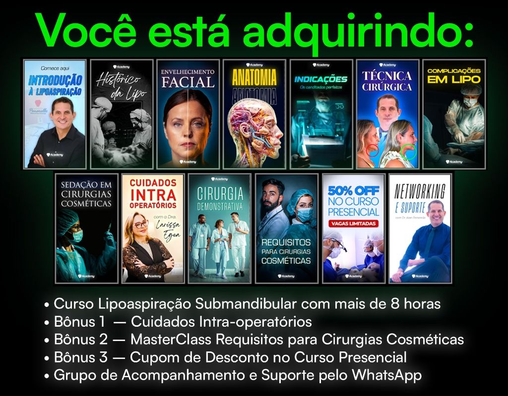 [+2 HORAS DE CONTEÚDO ADICIONAL] Se você deseja se aprofundar e levar seus procedimentos estéticos a um nível de excelência, adquira também o Curso Platismoplastia Descomplicada com 57% de desconto [SOMENTE AQUI]. Enquanto a Lipo de Papada foca na remoção de excesso de gordura, a Platismoplastia atua no músculo, conferindo resultados ainda mais harmônicos e duradouros. CHEGOU A HORA de fortalecer seu nome como referência na Harmonização.